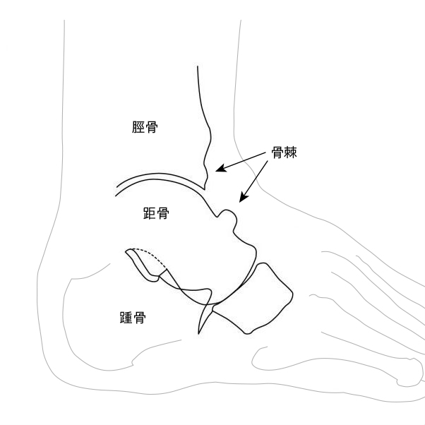 この距骨に骨棘と呼ばれる骨の棘ができ、足首を底背屈(足首を曲げたり伸ばしたりする動き)の際に骨棘が脛骨の関節面に接触し、痛みを発します。