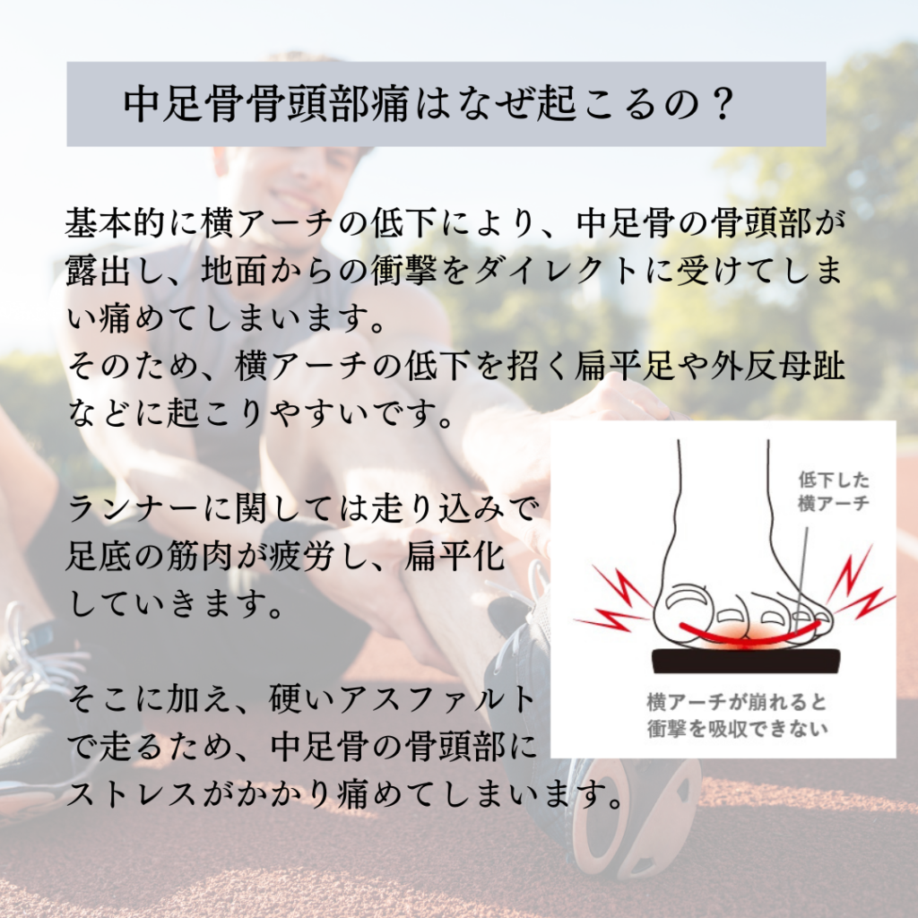 横アーチとは足裏の土踏まずを形成するアーチであり、足部のMP関節の辺りのアーチが落ち込み、それにより中足骨が地面に接地易い状態になります。