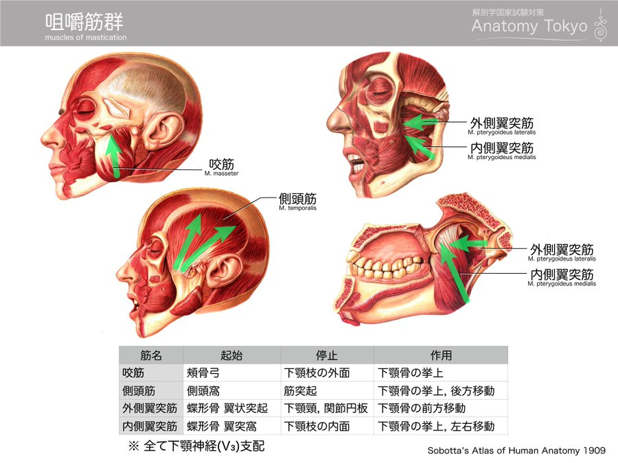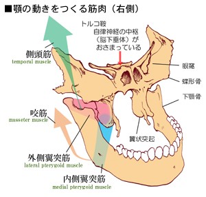 顎を動かす筋肉は咬筋、側頭筋、外側翼突筋、内側翼突筋があります。