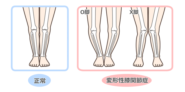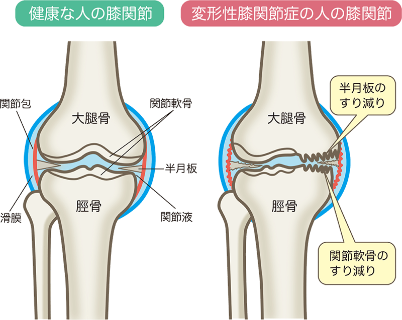 加齢に伴い膝関節を構成する大腿骨と脛骨の軟骨が摩耗によりすり減ります。その間に位置する半月板も同様にすり減るため、骨同士がぶつかり合い変形を起こします。
