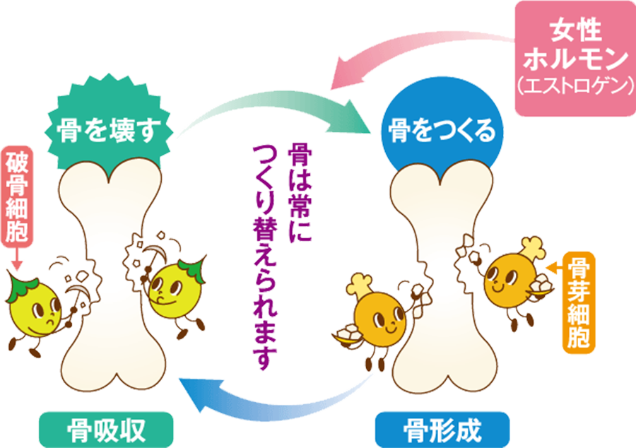 女性は妊娠出産をはじめ、閉経に伴い女性ホルモンの分泌量が急激に少なくなるため、骨代謝に関与してしまい、骨粗鬆症になってしまいます。
