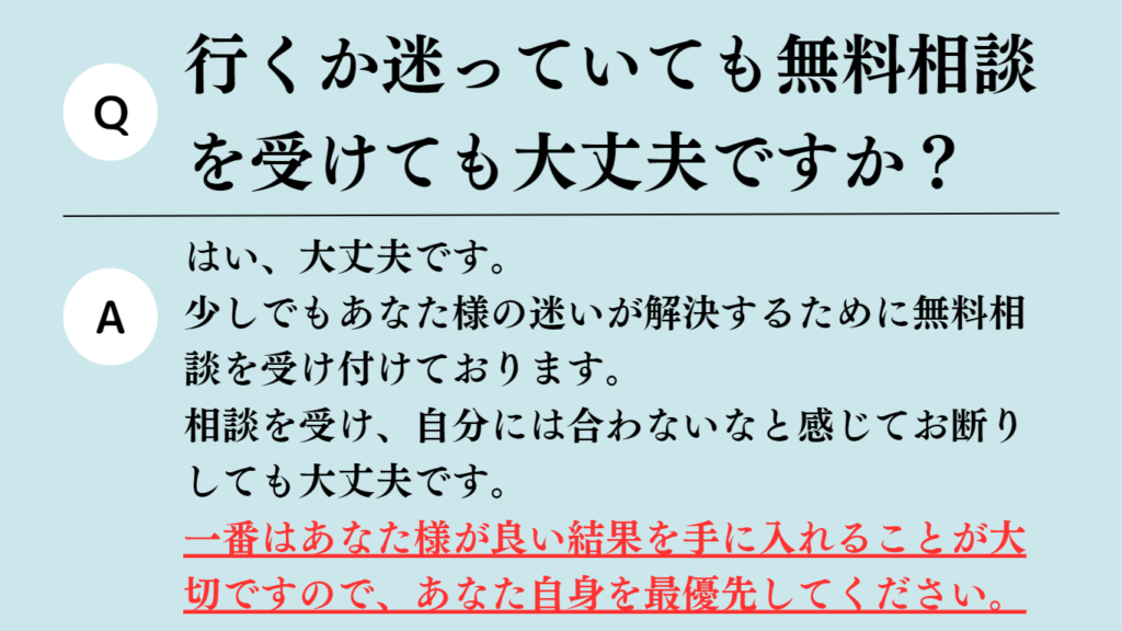 本当に今抱えている悩みを改善できるのか、実際にお越し頂いてご判断ください。