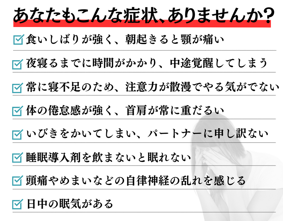 食いしばりが強く、朝起きると顎が痛い方、睡眠不足で日中に眠気が襲い、集中力・やる気が低下して仕事に支障をきたしている、自律神経が乱れ、頭痛やめまいがする。
