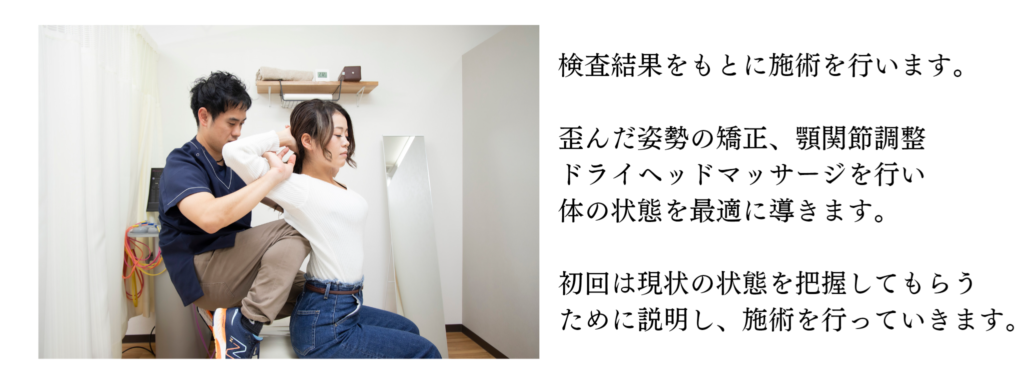 睡眠の質を改善するために姿勢矯正、顎関節調整、頭蓋骨調整によるヘッドマッサージを行い、土台である体の状態を改善していきます。