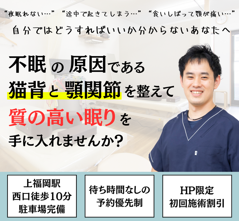 当院は睡眠の質の低下による食いしばりや姿勢の歪み、自律神経の乱れを改善し、根本から変える整骨院です。